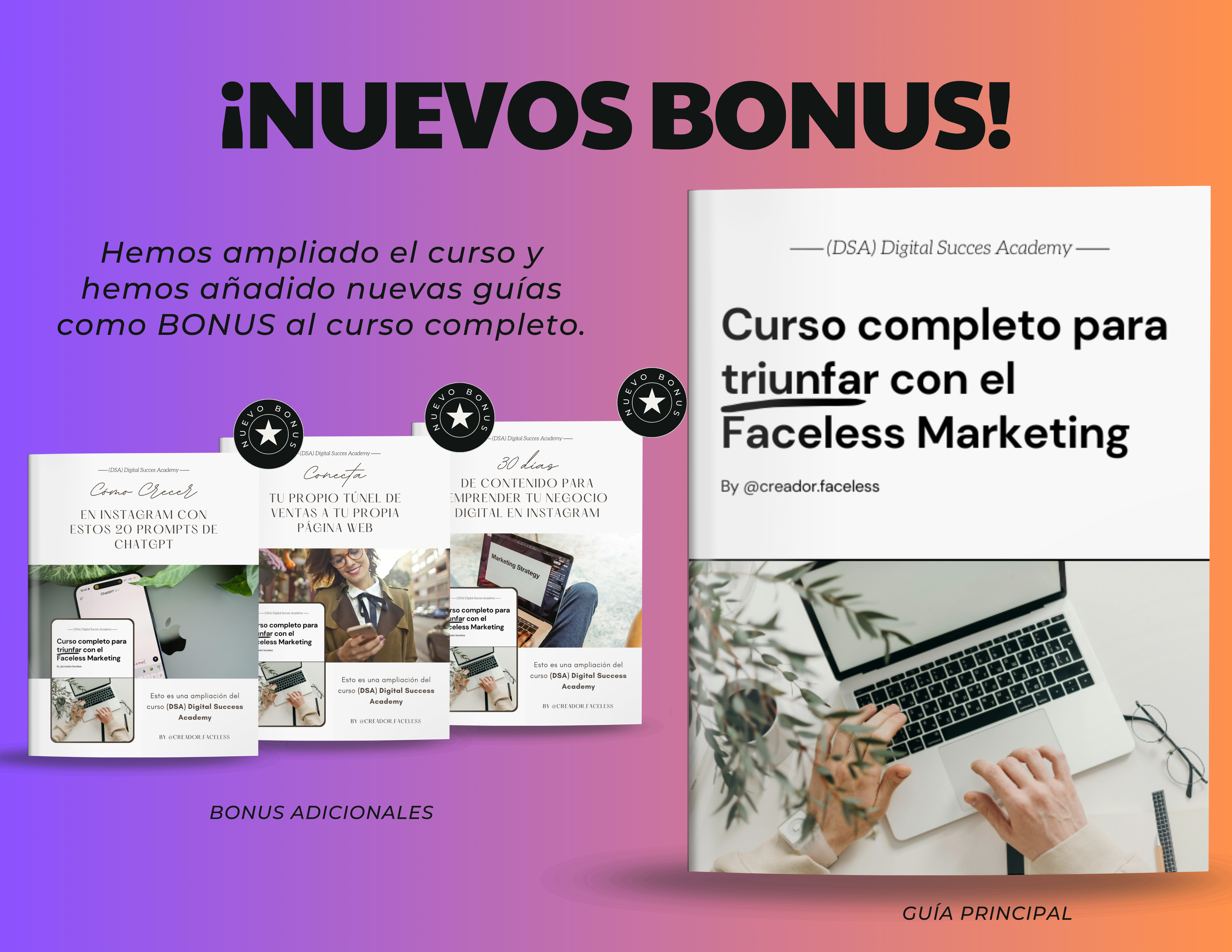 Con el CURSO DSA (Digital Succes Academy), curso completo para triunfar en internet con el Faceless Marketing aprende a desarrollar tu carrera digital en Instagram desde cero ocultando tu rostro. Descubre estas tácticas para alcanzar tus primeras ventas en internet y además, si quieres, ¡revende este curso y el 100% será para tí!
